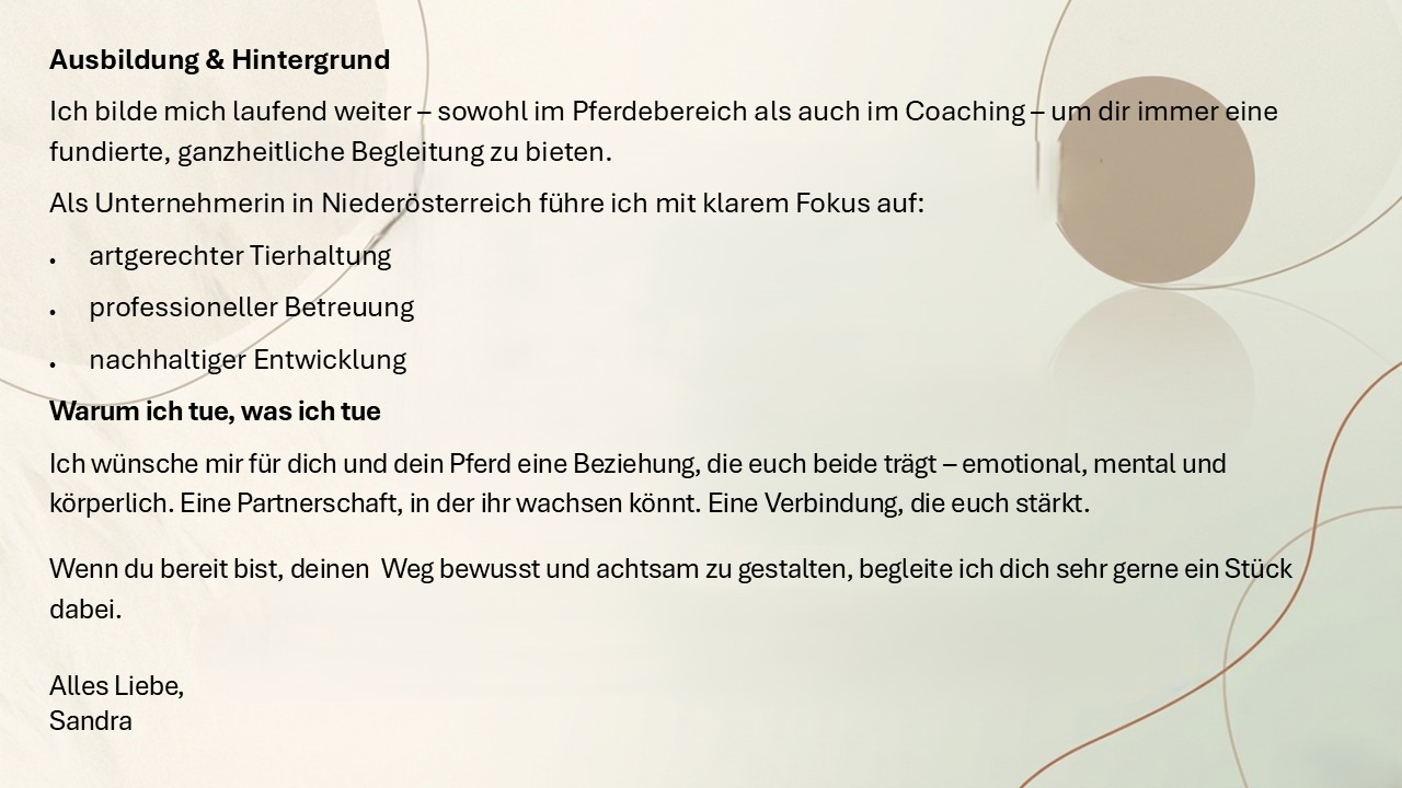 „Klare Kommunikation und das Verständnis dem Pferd beim Training Zeit und Pausen zu geben haben mir enorm weitergeholfen. Ich sehe seit den Trainings mit Sandra die Zeichen meines Pferdes viel klarer und achte auch vermehrt darauf. Mein Pferd ist seit dem viel Ruhiger beim Reiten und lernt sehr schnell. Einsetzen von gezielter Atmung und Energie waren mir vorher nie so bewusst. Ich würde Sandra auf jedenfalls weiter empfehlen!“