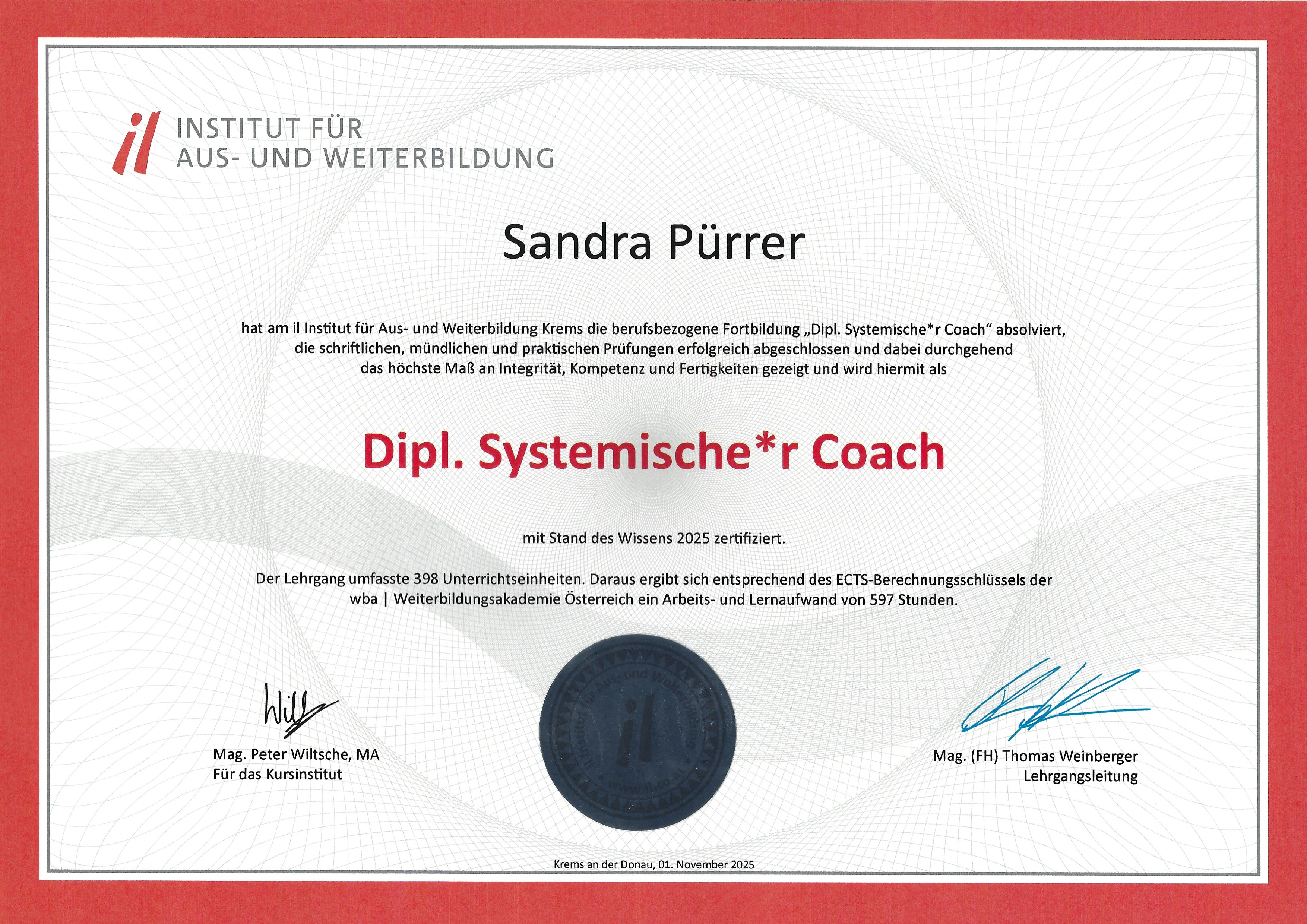 Mit großer Freude und Dankbarkeit blicke ich heute auf meinen Weg zurück, der mich zu diesem besonderen Meilenstein geführt hat: dem erfolgreichen Abschluss als Diplomierte Systemische Coach.